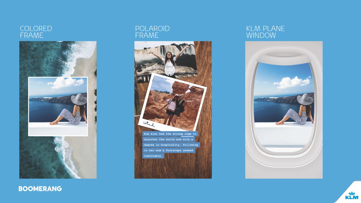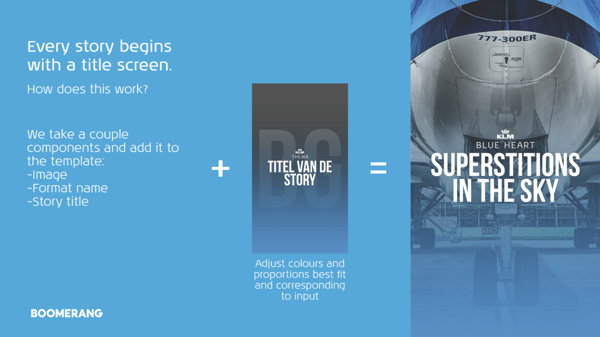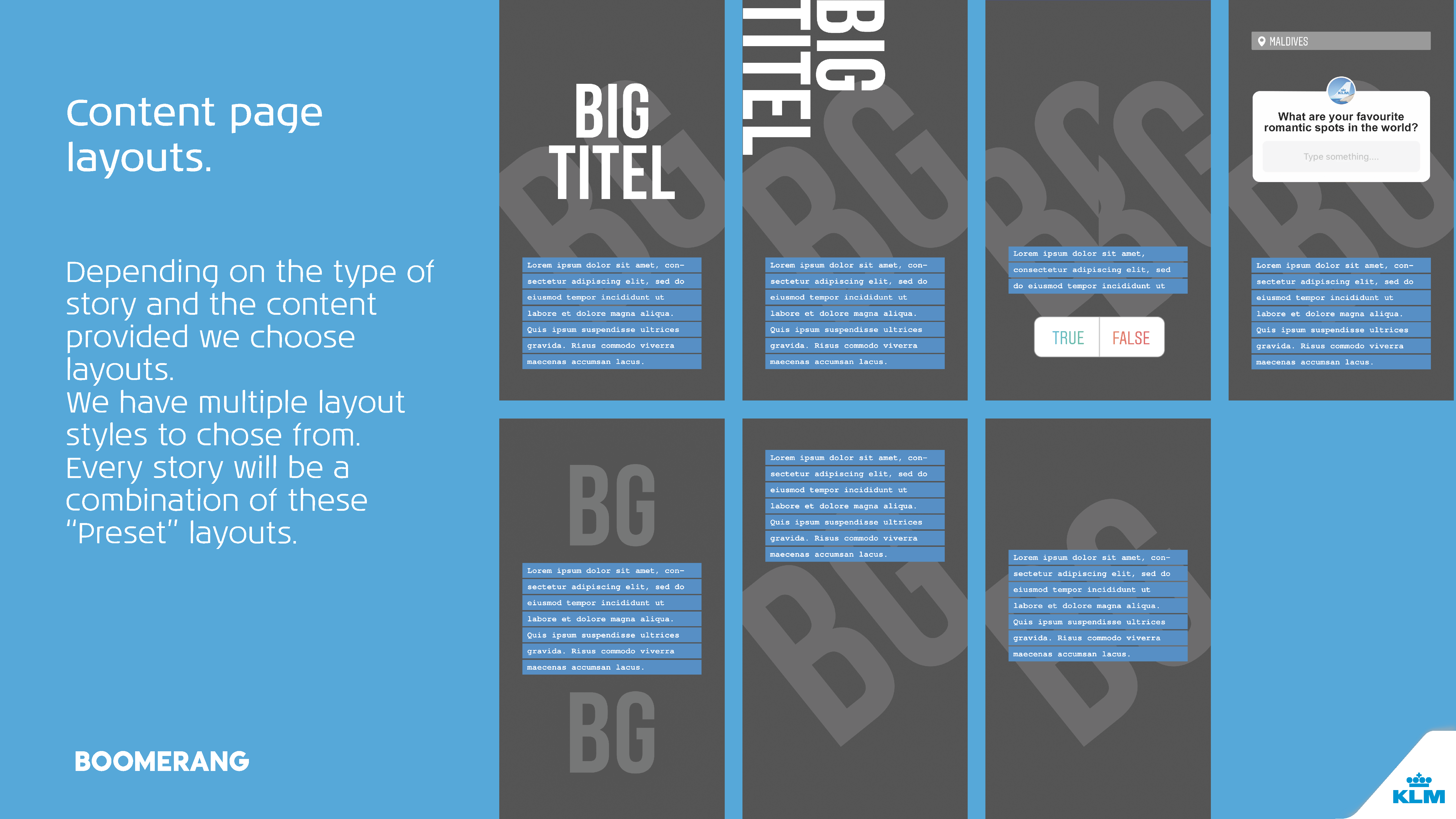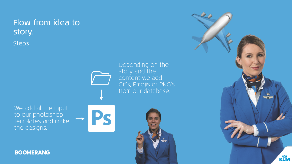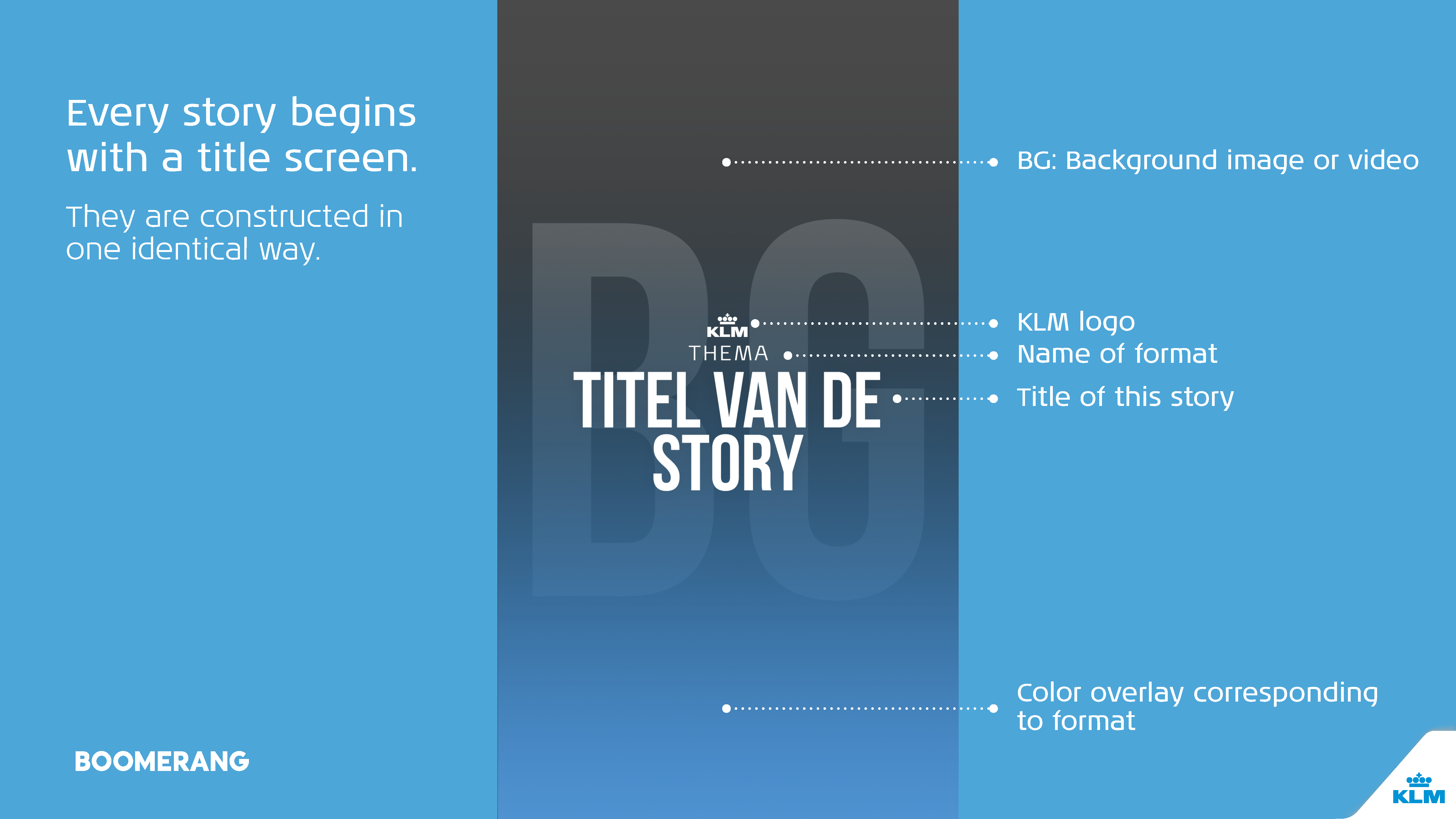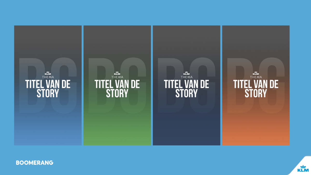 KLM was one of my clients wile working at BOOMERANG. But when I was added to the KLM team the processing time of story assets was way to long. KLM craved a easy adjustable format that meant being able to post multiple story’s on instagram each week. With existing style elements and specific requirements form KLM I made a template that could easily be edited and scaled. This consisted out of a static template in photoshop and a aftereffects project based on essential graphics so it could easily and quickly be edited.