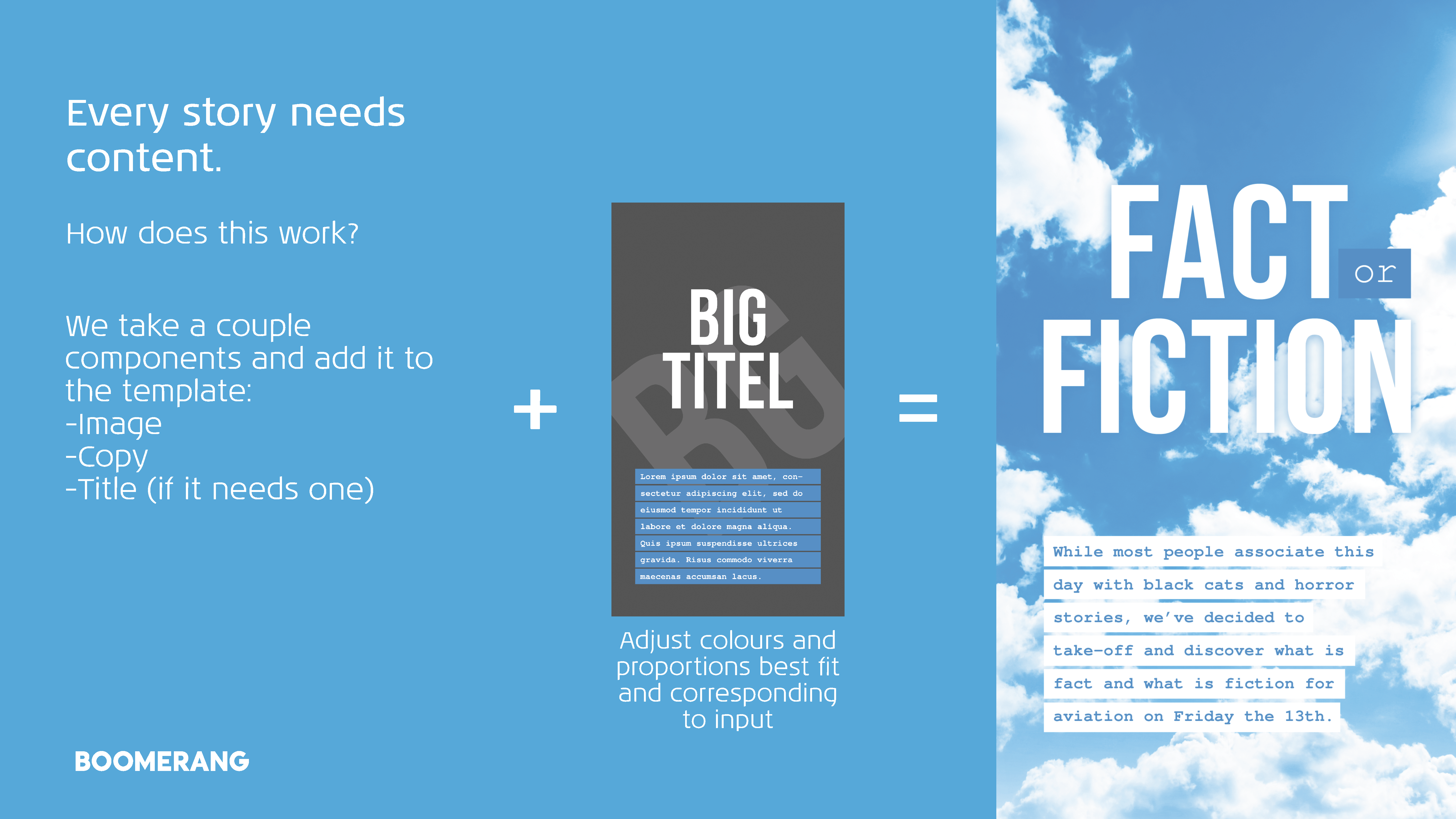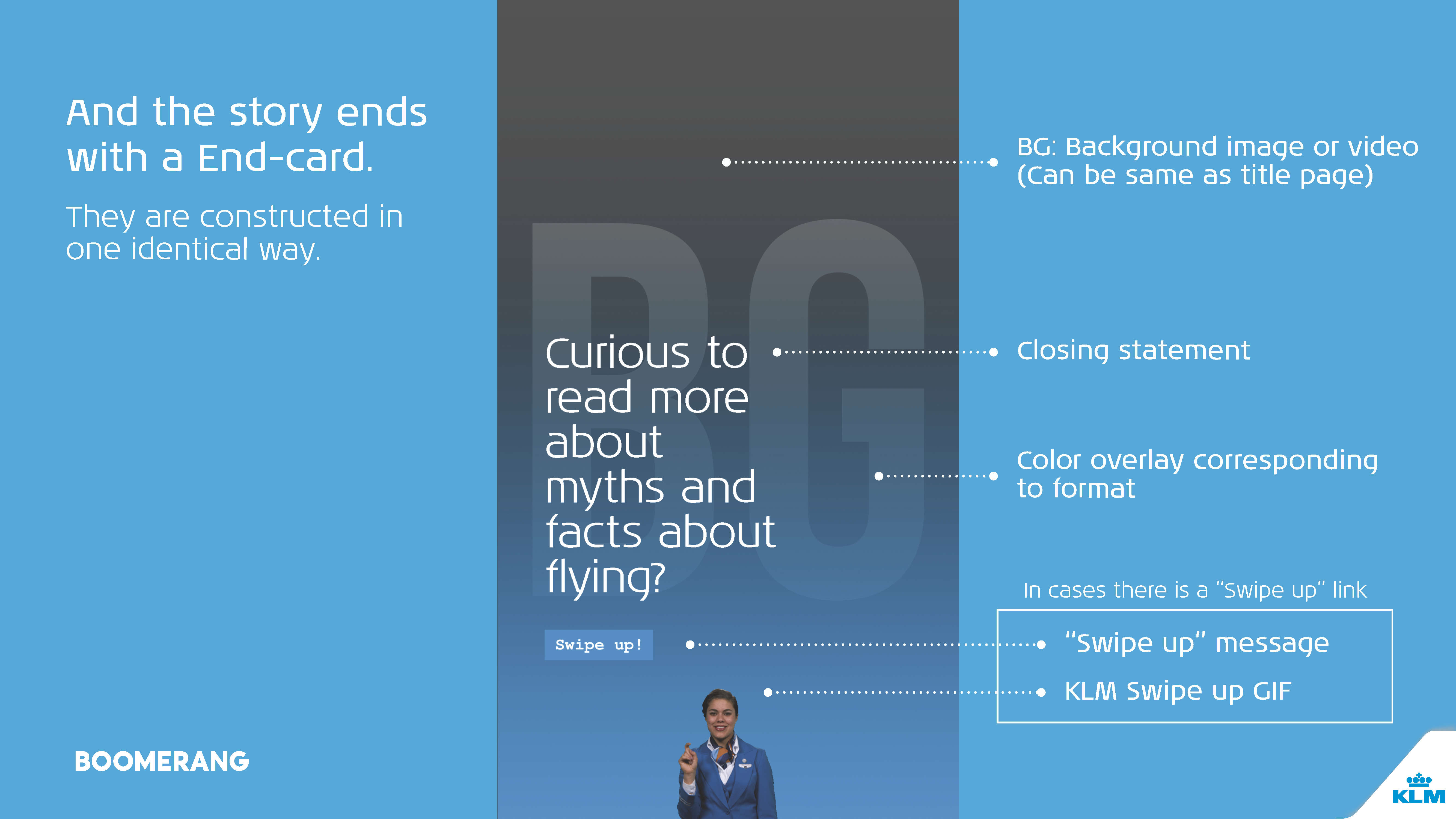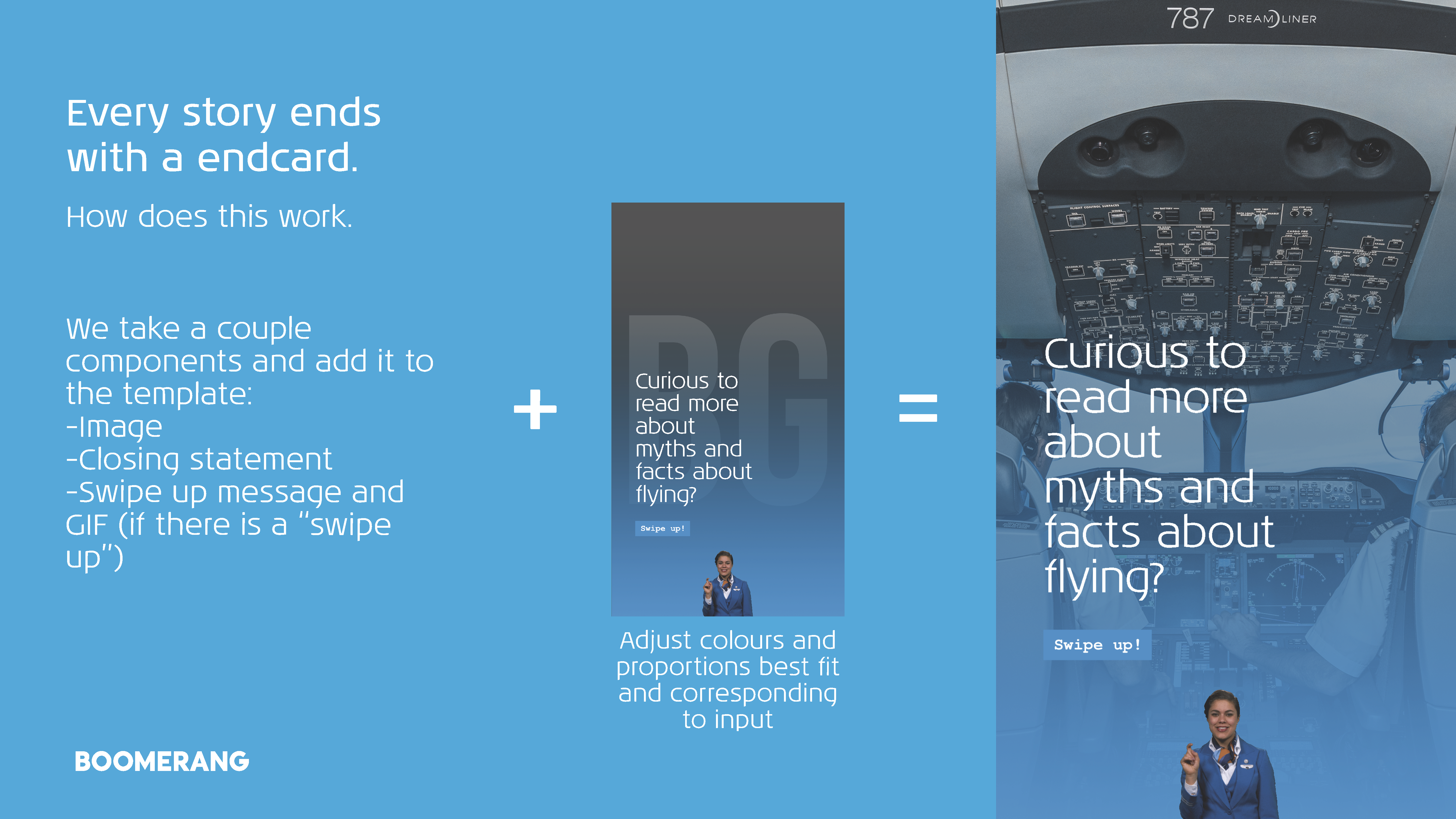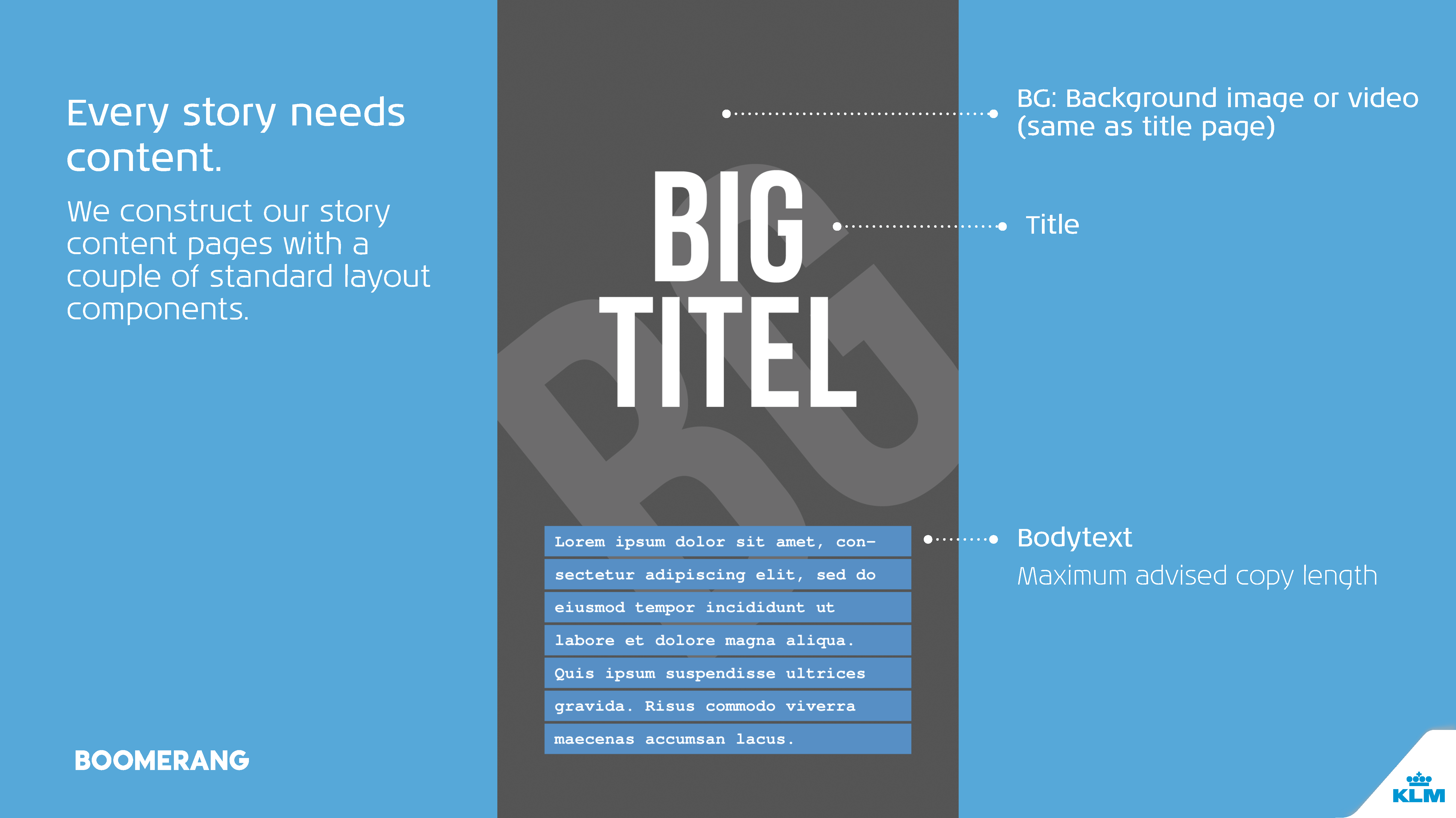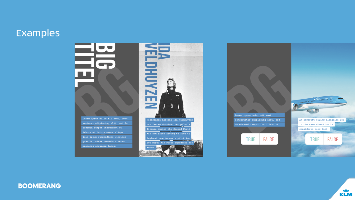 KLM was one of my clients wile working at BOOMERANG. But when I was added to the KLM team the processing time of story assets was way to long. KLM craved a easy adjustable format that meant being able to post multiple story’s on instagram each week. With existing style elements and specific requirements form KLM I made a template that could easily be edited and scaled. This consisted out of a static template in photoshop and a aftereffects project based on essential graphics so it could easily and quickly be edited.
